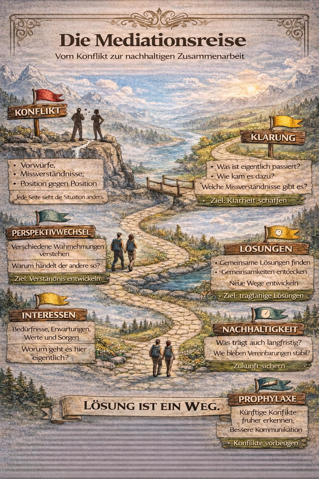 Mediation ist kein einzelnes Gespräch, sondern ein strukturierter Prozess. Die folgende Übersicht zeigt, wie wir Schritt für Schritt vorgehen.